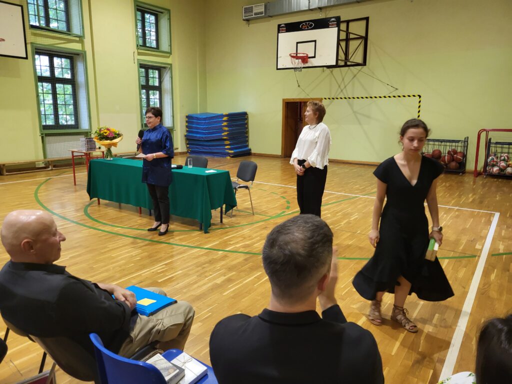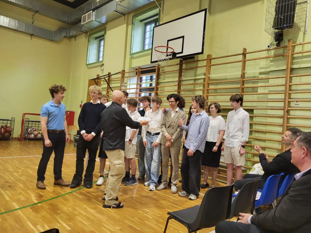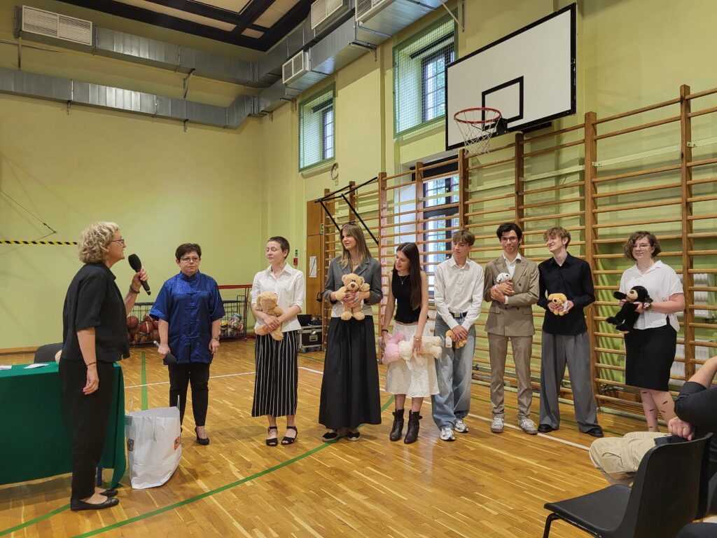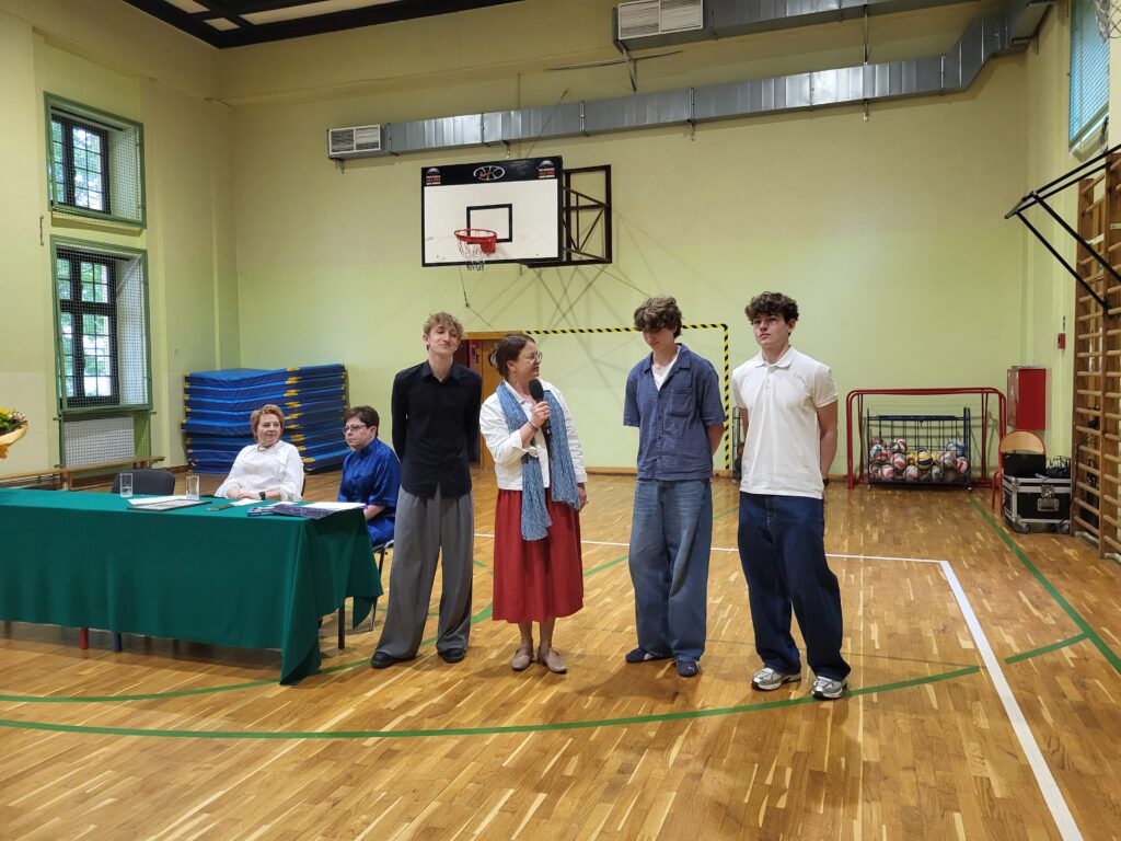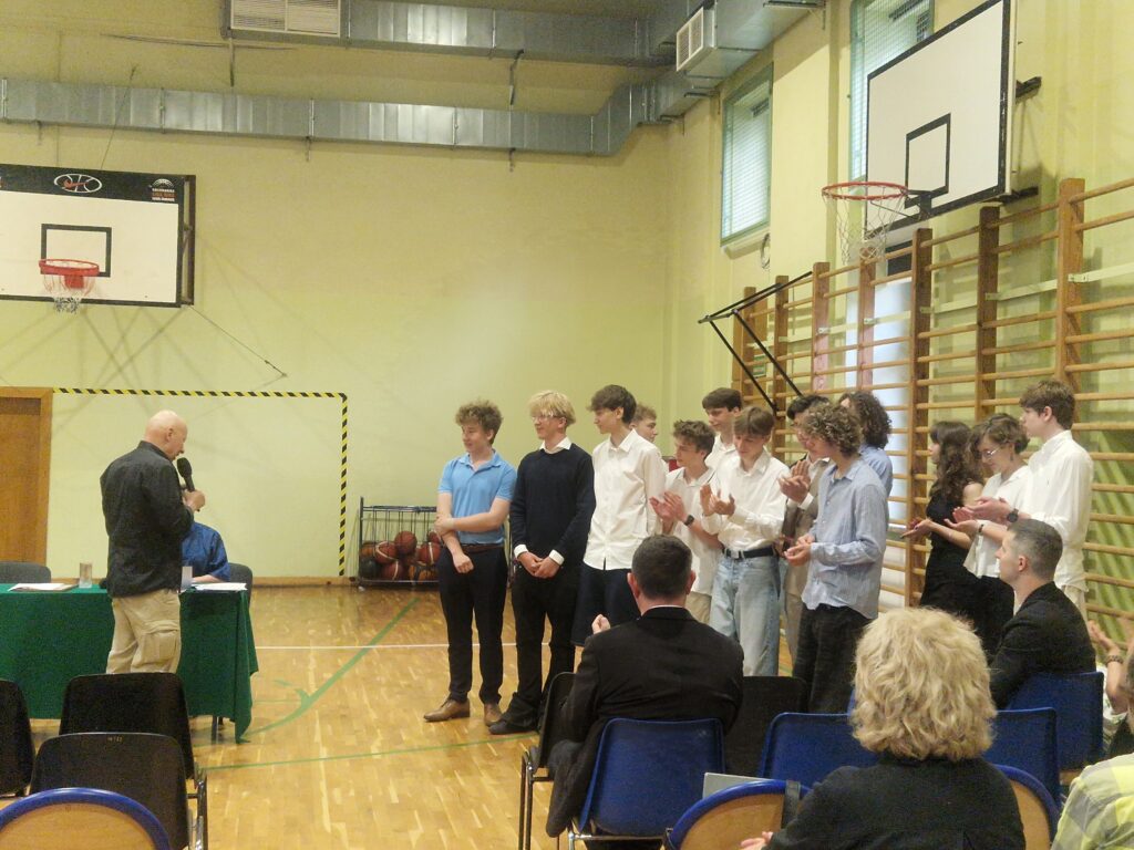 Dyrektor Anna Sobala-Zbroszczyk rozpoczęła zakończenie roku szkolnego od radosnej nowiny pomyślnego zdania przez wszystkich uczniów do następnej klasy i głos przekazała pani prezes Krystynie Norwie, która podsumowała udany rok i życzyła  wszystkim bezpiecznego powrotu z wakacji. Dyrektor Anna Sobala-Zbroszczyk potwierdziła, że mijający rok szkolny należy do bardzo dobrych, w którym uczniowie odnieśli sukcesy. Stanisław został laureatem olimpiady artystycznej oraz laureatem drugiego miejsca olimpiady języka polskiego. Olimpijczykiem opiekowały się Katarzyna Długołęcka i Zofia Łukomska-Chojecka. Natalia i Mikołaj znakomicie wypadli w konkursie logicznym. Ponadto Nina została laureatką 21. miejsca, a Nina (klasa maturalna), Juliusz i Leszek zostali finalistami olimpiady filozoficznej. To wszystko uczniowie osiągnęli pod kierunkiem Marcina Krupowicza.  Hela została wyróżniona przez Katarzynę Długołęcką za wytrwałość i dotarcie do ostatniego progu olimpijskiego. Dwoje uczniów, uczęszczających na zajęcia Grupy Calcullus zostało wyróżnionych przez Sławomira Jagiełłę za determinację w pokonywaniu trudności w poznawaniu teorii względności na poziomie akademickim.  Zosia, Berenika, Nadia, Maja  i Emilia stanowiły serce organizacyjne akcji na rzecz dzieci ze Zwierzyńca, a Antek, Stanisław, Julek, Kasia i Hania przygotowali dla gości grę miejską. Wszyscy wolontariusze otrzymali pluszowe nagrody i serdeczne gratulacje z rąk Anity Klepaczewskiej. W dziedzinie sztuki mówienia wyróżnieni zostali Mikołaj, Hubert, Filip, Hania, Stanisław, Iga , Nina, Maria i Zosia. Wspólnie dotarli do finału  Ligii Debatanckiej  pod opieką Katarzyny Nowak i Marcina Krupowicza. Krzysztof, Antoni, Michał, Maciej, Maks, Dawid, Mateusz, Jan i Gustaw zdobyli trzecie miejsce w turnieju piłkarskim na tegorocznym pikniku szkolnym. Wojciech Świątek złożył całej drużynie gratulacje.  Podziękował także kibicom i  nauczycielom-zawodnikom za sportowe zaangażowanie : bramkarzowi – Marcinowi Krupowiczowi, obrońcy – Aleksandrowi Pawlickiemu i napastnikowi – Sebastianowi Rajewiczowi. Hania, Jan, Julek oraz Julek W-Ż. otrzymali podziękowania od Marty Wierzbickiej-Kotte za energię i pracę przy organizowaniu konferencji Jasmun. Specjalistka od protokołu dyplomatycznego – Katarzyna Nowak także została doceniona. Sekcja techniczna tworzona przez Krzysztofa, Mikołaja  i Tomka również otrzymała podziękowania za sprawne funkcjonowanie. Na zakończenie głos zabrali członkowie Samorządu Szkolnego.